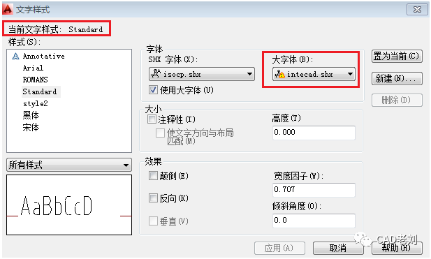 打开【格式】│【文字样式】,发现当前文字样式的大字体是“intecad.shx”,在它前面是一个感叹号,说明系统里面没有这个字体。