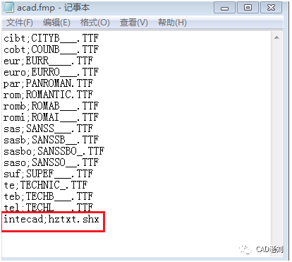 记住这个字体映射文件目录,然后在电脑里打开这个字体映射文件“acad.fmp”,并双击打开,输入“intecad;hztxt.shx”,这个就是表示用“hztxt.shx”字体代替“intecad.shx”;保存“acad.fmp”文件后,关闭文件。