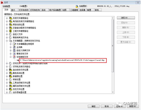 在CAD菜单中选择“工具”--“选项”--“文件”--“文本编辑器、词典和字体文件名"--"字体映射文件"。