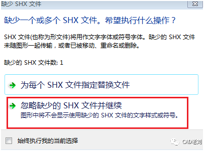 下面举例说明,打开一个CAD图形文件,由于图形文字所带字体没有,CAD就出现“缺少SHX文件”对话框,如图所示: